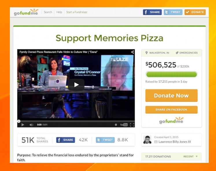 The Internet Fundraising site “gofundme” has crashed after literally thousands of businesses and individual people attempted to set up pages at the same time claiming hardship for standing up for their religious beliefs in Indiana. After the word spread that Memories Pizza had already raised over “half a million dollars” from discriminating supporters it seemed like everybody wanted in on this “Pot of Gold”